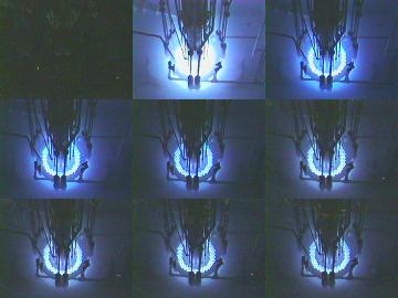 「パルス運転2分前」のアナウンスがあって、秒読みが始まります。私達は手すりにつかまって炉心を見下ろしながらかたずをのんで見つめています。何台ものビデオカメラやスチルカメラが放列をしいています。1分前になると周囲の灯りが一斉に消えます。これはサービス。