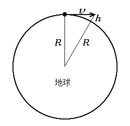 物体は水平に投げ出されて1秒間にvだけ進み、その間に式(2)の距離hだけ落下するのですが、もしも行った先で地球の丸みのために地面が同じくhだけ下がっていたら、物体は行った先の地面から見ると、もとと同じ高さにあることになり、一見落ちていないように見えることになります。