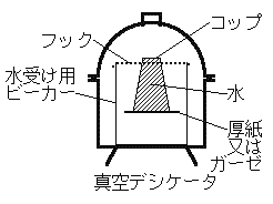 実験は図1のような装置で行ないます。コップは底部に銅の針金で作ったフックを取り付けてあります。真空デシケータの中が水浸しにならないように1リットルビーカーを受け皿にします。コップに水を満たして厚紙でふたをし、上記のフックをビーカーのふちにかけて逆さに固定したのち、真空ポンプを起動して排気します。容器内の気圧は途中に接続した水銀マノメータではかります。