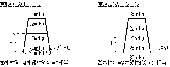 これらのデータをもとに、少々荒っぽいながら、実験中のいくつかのシーンについてモデルを作ることができます。水の表面張力とガーゼの張力によって数mmHg、厚紙の弾性で10mmHg程度に耐えることができるとすれば現象はほぼ説明できます。