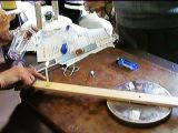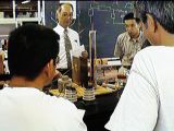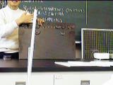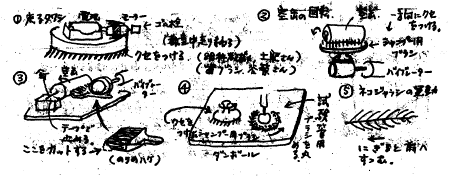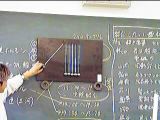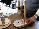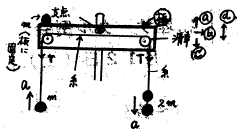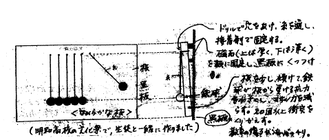 問 左の装置を作り、支えの手をはなし、おもりを加速運動させます。板の右側はどう動き出すでしょう。