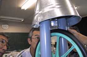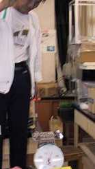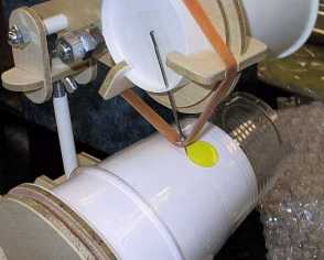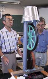 | 車輪を使ったバンデグラーフ (臼井さん) プラスチックのホイールをもつタイヤを利用して右の 写真のようなバンデグラーフ発電機をつくりました。ゴム ベルトをつかうという固定観念を打ち破る秀作です。 右下のハンドルを回すことで発電。 例会の日は雨で湿度が高かったので,電気のたまり具合 がいまひとつ。 バケツがよくない。とがった場所が多いから先端放電して しまう,という声もあり。バケツよりなべがいいのではという声も。 ほとんど廃品(失礼!)をつかって作ることに意義ありとの声も。 実験道具は,その性能も必要ですが,どのようにつくられて いるか,というような視点も,教育にはひつようですね。 |