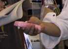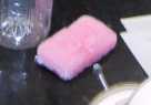| 弾性非弾性 (林さん) 前々から問題になっていた非弾性球の性質(ゆっくり力を加えるとゴムのような弾性を持ち,急な 力を加えると硬くなる)を持つ不思議なかたまり(写真の桃色の物体)をつくりあげました。 ゆっくり押すと,おもちのように柔らかく,頭でたたくとかなり痛い(硬い!)。 いったいどうやってつくったの? これが驚き!。なんと,スポンジに水飴をしみこませたもの。それをラップでくるみ乾燥を防ぐ。 水飴の粘性により,急な変形をしにくくなっていて,スポンジの弾性でゆっくりもとの形に戻ってい く。2つのものが実にうまく組み合わされています。 参考:島津の非弾性ボールについての説明 材料は高分子化合物の一種で,ポリノルボルネンと呼ばれるプラスチック。合成ゴムにこの新素材 を混ぜ,油を吸収させて反発係数の非常に小さいゴムをつくり,球状にしたものです。弾性ゴム球は 通常の合成ゴムを非弾性ゴム球と同一に成形。 |