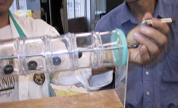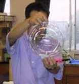 | 水柱 (山岡さん) 水を入れた2つの容器を向かい合わせに上下に隙間を 空けて置きます。右の写真の中身は水。真中部分は隙間 があいています。 だから,紙を通り抜けさせることもできます。 表面張力が,水がでてくるのを防いでいます。 どれだけ隙間の幅を広げられるか。試して見ませんか。 |