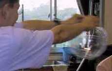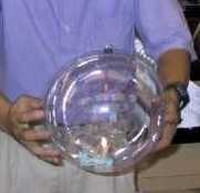 | 回転する炎 (清水さん) 球形プラスチックの中にろうそくを いれ火をつけます。 そのまま回転します。炎の形はど うなりますか。 ろうそくを容器の中で燃やすので, 回転による周りの空気の影響を受 けずにすみます。 次に,容器をそのまま真上に放り投げます。 今度は,炎はどうなりますか。 | ![]() | ![]() |