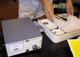 | 放射線の危険性 (井階さん) 放射線を出す鉱物はたくさんありますが,右の写真 は井階さんが手に入れた4種の鉱石です。γ線を測定 すると,かなりたくさん出ていました。 金属の容器に入れるくらいでは全く遮蔽できませんで した。 γ線のエネルギーによっても違いますが,1cmの厚 さの鉛の壁でやっと半減させられるそうです。コンクリート の壁なら10mの厚さが必要とのこと。 |