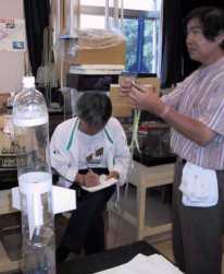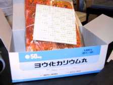 | 放射性物質飛散事故では,ヨウ素が甲状腺に取り込ま れやすいので,放射性ヨウ素を吸収する前に,ヨウ化カリ ウムを飲むのがよいとのこと。一人一日2錠。オレンジ色 の1枚に2錠ずつ10日分のヨウ化カリウム錠が入ってい ます。 チェルノブイリの近くでは,放射性物質が原因になって いると思われるガンの発症率が大変高いそうです。一人 一人がいろいろな災害に備える必要はあるのですが,放 射線事故にも備える必要もありそうですね。 |