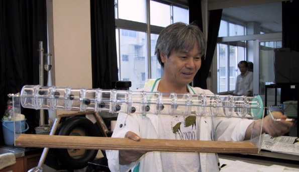 | 1時間でつくる水ロケット (林さん) ペットボトル3本とゴム栓,ビニールチューブ,自転車用タイヤ空気入れ口(空気入れをとりつける所にある部品),アルミ管 という材料で,1時間の授業で生徒に製作させる水ロケットを紹介。発射台までついている。 皆で作り,打ち上げ競争をやれば,盛り上がること確実。 生憎の雨で,発射実験は行なえませんでしたが,30mは上がるとのこと。 |