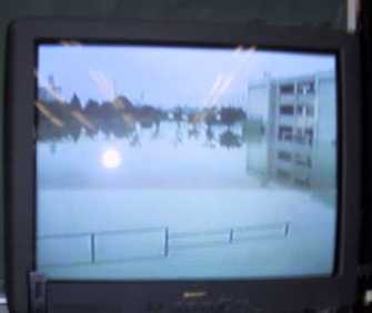 | 若宮商業の被害 (戸田さん) 勤務する若宮商業の水害被害についてビデオで報告。 右の写真はそのカットです。校舎の1階とグランドが完 全に水没していることがわかります。学校前の街も水没 しています。 1階の各教室は,施設教材が使用不能になり,元のよ うになるには,費用の面でも、時間の面でもかなりかか りそう。 理科室には,化学薬品,放射性物質等があります。 これらの物が2次被害を出さないようにする義務が あります。この視点で,被害後の愛知県の対応につ いて疑問が指摘されました。 |
