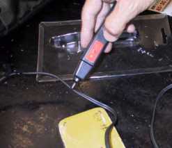 | 通電チェッカー (臼井さん) 導通していればブーと鳴り,断線していれば,そのさきでは鳴らないという道具。 写真のACコードは,色が見にくいですが左方で断線しています。この道具の先を コードに沿わしていくと,断線しているところまでは鳴りつづける。 テスターでは,断線していることは調べられますが,どこで断線しているかはわか りません。1000円ぐらいとのことです。1本あったら便利ですね。 ところで,この道具は何を調べて断線個所を発見するのでしょう。 電場の変化を調べているのでは,という考えが出されましたが,結論は?。 説明書にも詳しいことは書いてありません。仕組みがわからないと何となく 気持ちが悪いのですが,断線を調べるだけだからまあいいか?!? |