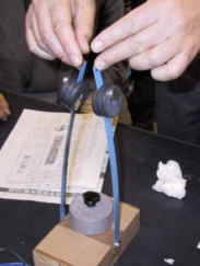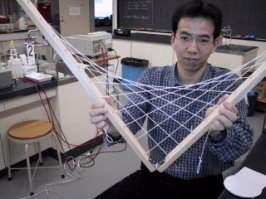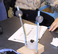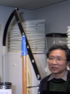 | 振動子の共振 (林さん) 写真のように、鉄ノコの刃に磁石をつけて、振動子をつくり 向かい合わせに斥力がはたらくようにします。振らせ方(最初の位相差)によって面白い動きをします。 |