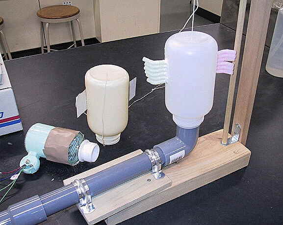 | ニューコメンの蒸気機関 (井階さん) 川上さんに続き第2弾の蒸気機関。 シリンダー部分に廃物の印刷用の容器を使っています。そのためピストン部分が熱に弱く長時間の使用には困難があるとのことです。ピストンをまっすぐ持ち上げるために、下の写真のように釜状の器具が必要とのこと。そういえば、ニューコメンの蒸気機関の図にはこのような形の器具がありました。いつもながらの精密製作です。 |