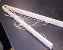 | さらに一題 ゴムひもで開閉式の器具を作りました。これを開くと、あら、双曲線が見える。ゴムひもをどういう風に張ってあるかわかりますか。 |