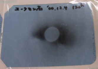 | 放射線を出す鉱物によるX線写真 (井階さん) 前々回の例会で発表した、放射線を出す鉱物を、X線フィルムの上において感光させたものです。間においた硬貨の丸い形がはっきり出ています。 |