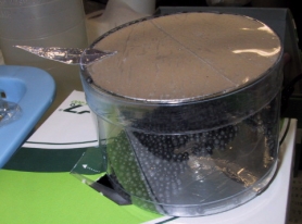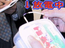 | 高電圧発生装置と利用 (林さん) 小型高電圧発生装置は、サークルではおなじみですが 普通は9ボルトの入力で3000ボルト程度の発生で使っていました。林さんはこれに18ボルトぐらいかけても大丈夫と確認。発生電圧も入力に比例して大きくなるとのこと。写真のように1cm以上はなしても放電します。 下の写真は、墨汁をつけて乾燥させた発砲スチロールを入れた容器。上下にアルミ箔で電極をつくってあります。これにさきほどの高電圧をかけると、写真のように発泡スチロールが踊りだします。分子運動を目で見る装置です。 摩擦電気でも十分踊ります。 |