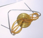 | まむしのたまご (前田さん) 写真のように、大型クリップと輪ゴムと5円玉でつくるびっくりおもちゃ。5円玉をまわしてゴムをねじります。それを紙を折った封筒に入れて相手に渡します。受け取った人は封筒を開けてびっくりというものです。 |