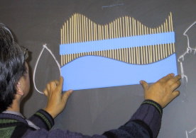 | 波の合成器 (山本さん) 夏のサークル交流会で、よせなべ物理サークルの石井さんが発表された、波の合成器の製作です。 プラスチックダンボールの穴に、3mm角の木材、ストッパーにはシリコンチューブを使っています。出来上がりを見るのは簡単ですが、作ってみると大変な作業だということがよくわかったとのこと。 下に様々な波の形を押し当てることで、重ね合わせの波形が一目でわかります。 |