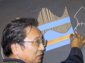 | 京都で生活していたが、中谷宇吉郎先生の弟子になりたくて、北大を目指し、 学生時代から雪や氷の研究を始めた。 札幌で上空から雪を模した紙を撒き、それがどうひろまっていくかの調査をし たことがある。上空の一点からまいた紙は札幌全域に広がることがわかった。降っ てくる雪を調べて上空の詳しい状況を知るのは、かなり難しいことがわかった。中谷 先生の「雪は天から贈られた手紙である」という言葉は読むためのプロセスが大切 であるということをいっている。 名古屋大学にきて、こちらには雪がないので、北極や南極、ヒマラヤなどに研究 にでかけた。氷河の変化などの研究が、いま地球温暖化の影響を量る重要なもの になっている。 知識を得るだけなら、本などから学んだほうがよい。直接人間が行う講義や研究 を見聞きするのは、失敗も含めて研究に対する態度、知識に対する態度を学ぶのだ。 だからこそ、人が人に直接教える 意味があるのだ。 |