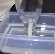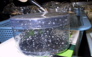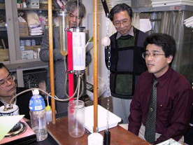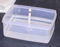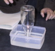 | 龍神 (奥谷さん) 写真のように、水を入れた容器の中でろうそくを立て燃やし、上から瓶をかぶせると水が上がってきます。これを龍神というそうです。 これは、どんな原理で起こるのでしょうか。 「伊東家の食卓」でも放映されたそうですが、よくいわれるのが、燃焼によってできた、二酸化炭素が水に溶けて、その分圧力が減って水が上昇するというものです。 ここでその説に対する異論が出ました。 二酸化炭素はそんなに水に溶けないという説です。 水が上昇するのは、かぶせるときの内部の暖ためられた空気が 水に触れて、冷えて収縮することで起こる、という説です。その検証 のための実験が、最後の写真。 ろうそくと着火器でビーカー内部を暖気で満たし、かぶせました。 確かに水はかなり上昇しました。 |