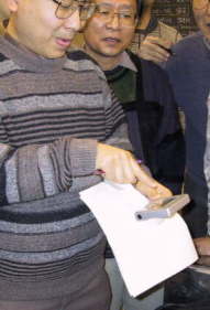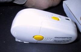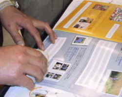 | スキャントーク (前田さん) マウスのような装置。スキャントークというそうです。大きさはマウス程度。これを右の写真のようにバーコードのようなものの上をなぞると、音が出ます。鳥の声、寅さんの声などたくさんあり、自分の声のバーコードも創れるそうです。 このバーコードのようなもの。みただけではどれも同じように見えます。デジタルデータであることは推測できるのですが・・・。 |