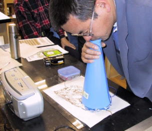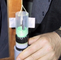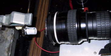 | α線を見る (林さん) ナイトスコープをつかい、α線が蛍光物質にあたったときの光を見よう、というわけです。かのラザフォードも原理的にはこのような方法でα線を観測したはずです。 下の写真の容器の中にα線源があり、蛍光物質をぬったおおいをしてあります。α線が蛍光物質にあたったときのかすかな光をナイトビジョンで見るわけです。 部屋を真っ暗にしてようやく見える程度。星の瞬きのように見えます。 ![]() |