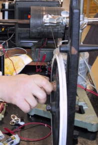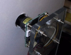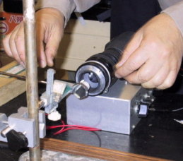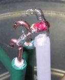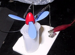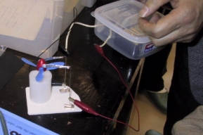 | 誘電体を使ったフランクリンモーター (奥谷さん) 写真のようにプロペラの両端に電極を近づけ、高電圧をかけるとあら不思議。プロペラが回りだします。プロペラに金属がないけれど、これはフランクリンモーターです。プラスチックの表面が、高電圧に対して、導体ではないが電荷をためる性質を持つとき回るようです。 NHKの「何でも実験室」で紹介されていた実験の追試です。 |