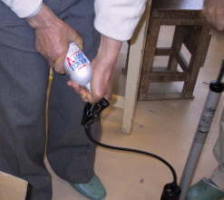 | 断熱圧縮と断熱膨張の体感 (鈴木さん) 瓶型アルミ缶を使って、空気の、断熱圧縮では温度があがり、断熱膨張の際は温度が下がる、ということを体で実感しようというもの。 容器に空気を入れていくと暖かくなり、栓が飛んで空気が吹き出すと冷たく感じるわけです。 金属は熱伝導性がよいので、容器を握っているだけで温度変化を感じることができます。 |