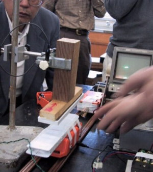 | 衝突における力積 (林さん) 弾性衝突と非弾性衝突との差をとことん追求。 向こう側のオレンジ色の台車が手前の台車に衝突します。手前の台車の白い四角のものはコイル。上の矢印のある木の下に磁石がとりつけられており、衝突の際の動きを電磁誘導で捕まえます。 オシロスコープの上側は生の測定値のグラフ、下側は測定値を微分回路に通したグラフです。 台車にばね定数の大きなばね(非弾性に近い)をとりつけて衝突させると、山形のピークが上がり、山の幅が狭くなります。つまり、瞬間的に大きな力が発生するが、持続時間は短く、力積としては弾性衝突より小さくなる、ということでした。 (オシロスコープの映像↓) ![]() |