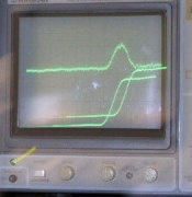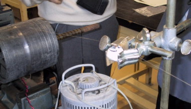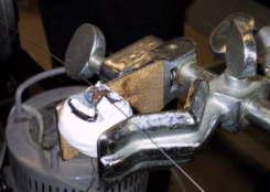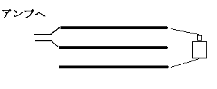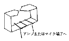 | 針金テープレコーダー(ワイヤーレコーダー) (林さん) テープレコーダーの原型(!?)。図のようなヘッドを使い、ピアノ線を音声信号で長さに垂直方向に磁化し、それを再度同じヘッドで読みとろうというもの。ヘッドはスチール缶を図のように切って、それにコイルを巻いて作りました。 ピアノ線を適当な速さでヘッドの間を滑らせると確かに音が聞こえます。こんなものに音が記録できるなんて、実物見なければ信じられませんね。 ![]() |