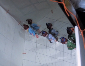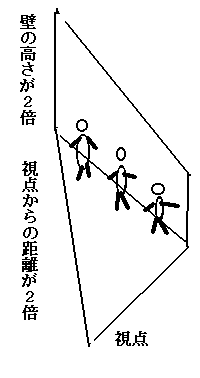 | エイムズの部屋 (戸田さん) ピンホールカメラを使ってエイムズの部屋をのぞきました。 エイムズの部屋とは下図のような部屋です。いびつな構造ですが、カメラを通してみると向こう側の壁が水平に見えます。 ![]() |
