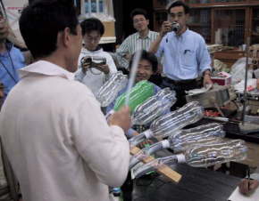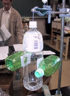 | ペットボトル楽器 (杉本さん) ペットボトルに、写真のように自転車の空気入れの部分をとりつけ 容器内の圧力を、空気入れでコントロールしようとういうアイデア。 圧力をいろいろ変えることで、いろんな高さの音を出せます。 いろいろな形の容器がありますが、コカコーラの容器が一番いい音がするようです。 ![]() |