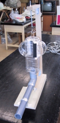 | ファイマンタービンその後 (山岡さん、杉本さん、飯田さん、奥谷さん) 前回の山岡さんのファイマンタービンの実験を受けて、4人の方がさらに追及をしました。こんどは回転容器を大型化。容器の下から掃除機で空気を吸い込むと、空気の流れと反対方向に勢いよく回ります。空気の流れが定常流だと、内部の圧力は1気圧より小さく、腕(出っ張った部分)の反対側から1気圧で押されるためだという結論に。 ただ、空気流が定常流ではない場合、強い吸引により渦ができるような場合は、ややこしいことが起き、圧力は不定になるようだという推測もだされました。それは、今後の研究課題に。 奥谷さんが、フィルムケースでミニ化。ドライヤーの吹き出し口と吸い込み口を利用して、一台で吸引と吹き出しを実現。装置の小型化かつ可搬性をそなえました。 |