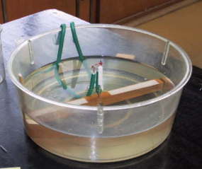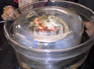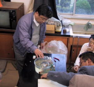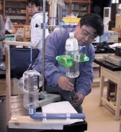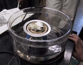 | 「龍神」の本当の原因 (臼井さん、山岡さん) 水を張った皿にろうそくを立て、上からコップをかぶせると、コップに水が入ってくるという現象(これを龍神というそうです)の原因を探る実験です。 臼井さんは水を張った容器の中に電熱器を置き、その上に紙を置き、ガラスの容器をかぶせてからスイッチを入れます。紙が燃えたあと水面はどうなるでしょう。 山岡さんは、同じことをろうそくで行いました。マッチの頭を使っての自動点火。あらかじめ容器をかぶせておき、点火します。ろうそくが燃え、容器内の酸素がなくなって火が消えたあと水面はどうなるでしょう。 いずれも水面は上昇しませんでした。つまり紙やろうそくが燃え、酸素が二酸化炭素や水に変わって水に溶け込んだりすることが、水面が上昇する原因ではないということです。 では何が!。 空気の温度変化というのが正しいようです。 ![]() マッチの頭を使った自動点火装置 |