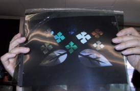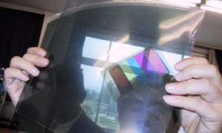 | 偏光 (奥谷さん) 偏光板の間にポリプロピレンのシートを入れることで様々な色が出ます。ポリプロピレンは方向性のある分子であるためで、シートの厚さや向きを変化させることで色づきが変わってきます。 セロテープでも同じことができます。 切り紙にポリプロピレンのシートを上手に張ると、偏光板にはさむだけでカラーの絵に変わります。 小学生は特に喜ぶんじゃないかな。 (えっ! 高校生のほうが喜ぶって?・・・・) |