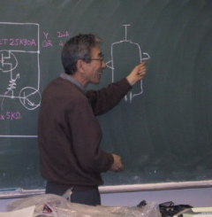 | 熱についてのまとめと考察 (飯田さん) 「気体に仕事をするということは分子運動をそろえる作業だ」 とのテーマのもと、かなりの量の論文を提出。あまりに多すぎてその場では読めないので皆さん勉強しましょうということで今回はおしまい。ファイマンタービンのところでも、分子運動のイメージでの説明が求められました。熱や圧力の分野では、わかっている法則に頼りきって豊かなイメージをつくる作業を怠っているかもしれません。 |