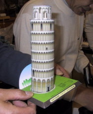 | ペーパークラフト-ピサの斜塔 (前田さん) キャノンのホームページから設計図をダウンロードできるそうです。アクロバットリーダーが必要。 ガリレオの話をするときに、机においてあるだけで話の真実味が増す効果があるかもしれません。 http://bj.canon.co.jp/japan/papercraft/ |