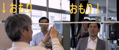| 作用反作用の例 (川田さん) 作用反作用がよくわからないという生徒への説明の一例。 左の錘は棒を上げよう(左回転しよう)としている。右の錘は棒を下げよう(左回転しよう)とする。 2つの棒が接する点で力が働き、両方の棒がとまる、というわけです。 作用反作用は一度ならっただけでは理解しにくい概念です。わかりやすい実例とうまい説明を研究する必要があるかもしれません。 |