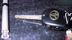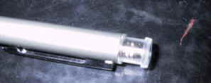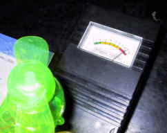 | 電界強度計 (奥谷さん) 電界強度計を2つ紹介。ひとつは右のようなメーター型。近くでモータ(緑色のもの)を回すと針が振り切れます。携帯電話を近くでかけるとやはりメーターは振り切れます。かなりの電波が出ていることがわかります。 もうひとつはペンシル型。これは持ち運びに便利。先の部分が光ります。 車のキーからは何が出ているか、という質問があり、早速試してみました。 でも光りません。 車のキーは何を利用して遠隔操作をしているのでしょう。 |
