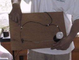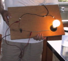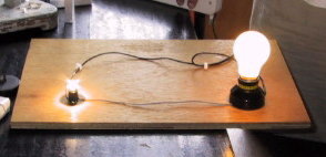 | 白熱電球と豆電球 (前田さん) 30Wの白熱電球と6.3Vで0.15Aの豆電球を直列につないで、両方つけたい。 どうしたらよいか、という問題です。 そのまま100Vにつなぐと、豆電球は切れてしまいます。 答えは下の写真。まず豆電球部分をショートさせて白熱電球をつけます。白熱電 球が点灯すると、温度上昇により抵抗値が増大します。その時点で豆電球に通電。 こんどは切れずにちゃんと点灯します。 フィラメントの抵抗値が温度により大きく変化することを利用したうまい実験です。 |