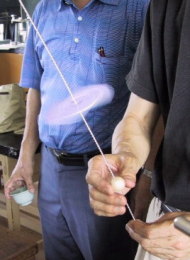 | 遠心力おもちゃ (前田さん) 針金を2本ねじった軸に、カードに穴をあけて差し込みます。下から押し上げると、いきおいよく回転します。昔からあるおもちゃの手作り版です。カードの穴の形に注目ください。 このような形に穴をあけるのがポイント。 |