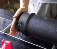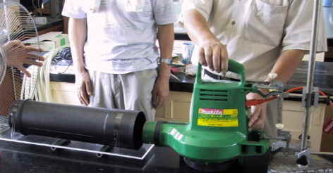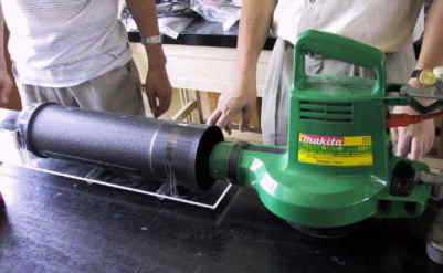 | 筒はどうなる? (林さん) 下の写真のように、自由に動ける筒を用意し、ブロワーで内部に空気を送ってやります。さて、筒はどうなるでしょうか。 実験してみると、筒がブロワーの近くにあるときは、筒はブロワーに向かって動き出します。筒がブロワーから離れていると、筒はブロワーから遠ざかる向きに動き出します。(当然、動かない場所もあります) では、いったいなぜブロワーに向かって動き出すのでしょうか。 いろいろな考えが出されましたが、結論には至りませんでした。 右側の写真のように、出口に手をかざすとブロワーへの動きが止まり、逆向きに動きます。これも不思議。 流体は難しい・・・・。 |
