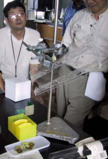 | コイン選別機 (前田さん) コインの種類によって落ちる場所がかわるという、コイン選別機。 出口にある”へ”の字型のものがくせもの。実はコンピュータのハードディスクの磁石。(下の写真) 原理は、落ちていくコインに生じる渦電流。コインの種類によって、材料が異なるため、渦電流の大きさに差が出ます。このためブレーキの係り具合が 変わるということです。 ![]() ![]() |