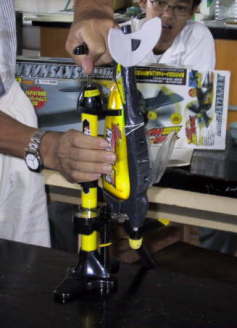 | 空気エンジン飛行機 (臼井さん) 空気エンジンを利用した飛行機。ポンプで空気を圧縮して貯め、プロペラを回して飛ぶというもの。空気を入れてから主翼と垂直尾翼をつけます。 残念ながら、うまく飛びませんでした。機体が重すぎるという意見も。 もしそうなら、飛ばないおもちゃを売るなんて、とんでもいない話ですね。 |