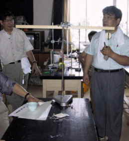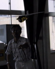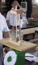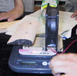 | 揚力 (清水さん) 写真のような、翼と送風機と一体になった装置をはかりの上に載せて、送風を開始すると、はかりの目盛りはどうなるかという問題。 翼が受ける揚力により、見事に目盛りは小さくなりました。(ほんの少しですよ) ![]() |