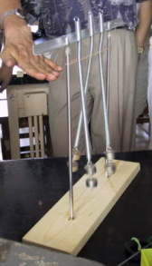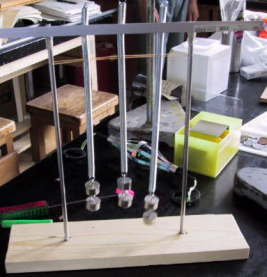 | 団子三兄弟 (前田さん) 水平なL字アルミにばねをつけてぶらさげます。 輪ゴムの存在により3つのばねは共振します。 この装置のいい点は、ばねの長さを自由に変えられるという点。(アルミにひっかけるだけ)ばねの長さが変わるということは、ばね定数が変わるのと同じ。よって共振をコントロールできます。 |