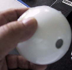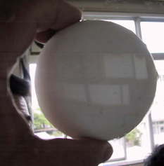| 目玉モデル (奥谷さん) おもちゃがはいっている透明球を利用して目玉のモデルをつくりました。片側に穴を開けレンズをつけます。反対側をサンドペーパーでけずり、半透明にします。そうして外を見てみると外の景色が映ります。眼球がどういう構造をしているかの面白いモデルです。 ただし、球の大きさにあった焦点距離を持つレンズを探すのが大変。 |