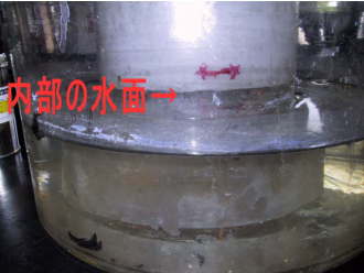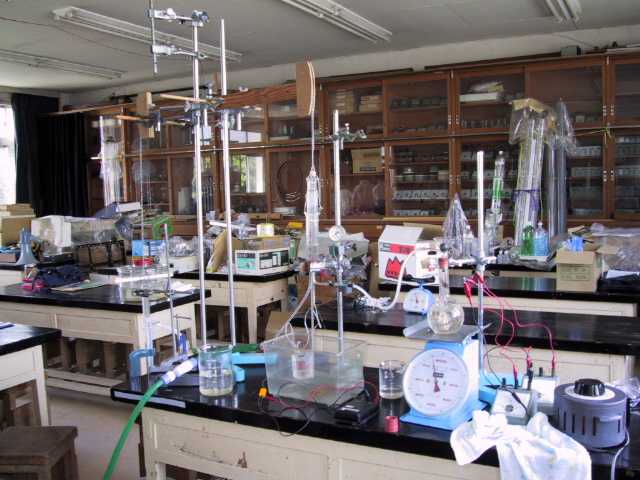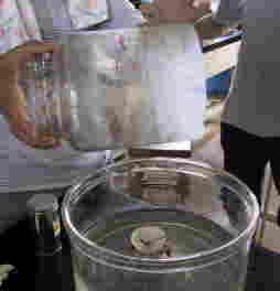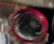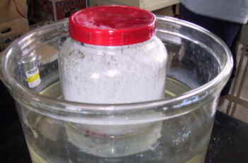 | 龍神 (川田さん) 前回の龍神実験の発展版。 梅酒の瓶の底を切り落とし、ふたにはアルミ箔をはって熱に耐えられるようにしてあります。蓋付きの利点は、内部の圧力を簡単に外部と等しくできること。 紙などを燃焼させると、内部の期待は一時的に膨張し(水面が下がる)、やがて元の体積にもどることが確かめられます。 下の写真は、リンを燃やしたときのもの。リンの燃焼によりできた酸化物は水に溶けるので、この場合は水面が上昇します。完全に酸素が使われれば、1/5の体積減少が起こるはずですね。 |