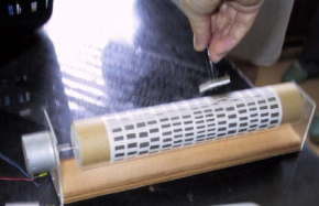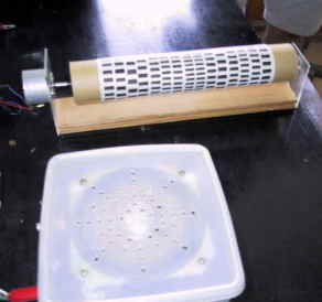 | 光オルゴール (奥谷さん) フォトトランジスタを使った受光器で、明暗の信号を拾い、音としてだす、フォトオルゴール。 白色ダイオードで光を出せるようにしてあるので、暗いところでも大丈夫。 円筒のデータはちゃんと音楽になっていて、円筒を回転させて、端から受光器を動かしていくと楽しいメロディが聞こえてきます。 |