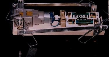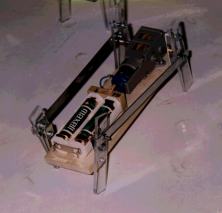 | 歩く犬 (清水さん) 中国の長春の韓先生が、夏に日本に来られたときに、披露してくれた歩くおもちゃをつくりました。ひとつのモーターで4本足を上手に動かして、きちんと歩くというのは、簡単そうで作るのは難しい。 でもこれは頭がない。考えて歩いているわけではないから、まあいいか・・・ |