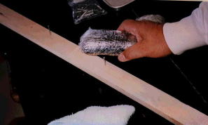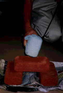 | 非弾性スポンジ (林さん) スポンジに水あめをしみこませます。 ゆっくりおすと柔らかですが、急激な力には、まるで剛体のように硬くなります。 釘も打てるくらいです。 このスポンジをタオルでくるみ、上から振り下ろすと・・・。 何と、レンガが割れてしまいます。空手やテコンド(韓国の武術)でのレンガ割りは、非弾性現象でしょうか・・・・・。 |